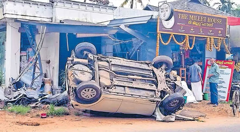 മുഹമ്മ ആര്യക്കര ജംക്ഷനു സമീപം മതിലും ഗേറ്റും കടകളും ഇടിച്ചു തകർത്ത ശേഷം റോഡിൽ തലകീഴായി മറിഞ്ഞ കാർ.