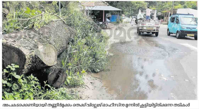 മുഹമ്മ: ആലപ്പുഴ – തണ്ണീർമു ക്കം റോഡിൽ ആര്യക്കരയി ലെ തണ്ണീർമുക്കം തെക്ക് വില്ലേജ് ഓഫീസിനു മുന്നിലെ തടികൾ യാത്രക്കാർക്ക് അപകടക്കെണിയാകുന്നു. ഇവിടെ അപകടാവസ്ഥയിൽ നിന്ന മരം വെട്ടിമാറ്റണമെന്ന ആവശ്യം ഉയർന്നപ്പോൾ റവന്യൂ വകുപ്പാണ് മരം മുറിപ്പിച്ചത്. എന്നാൽ മുറിച്ച മരത്തിന്റെ തടികൾ ടെ റോഡിരികിൽ കൂ ട്ടിയിട്ടിരിക്കുകയാണ്. റോഡി ൽ ഈ ഭാഗത്ത് താഴ്ചയുള്ളതു ക്കൊണ്ട് മഴവെള്ളം കെട്ടി നിൽക്കുകയാണ്.കാൽനടയാത്രക്കാർ ഈ ഭാഗത്ത് റോഡിലേക്ക്കയറിയാണ്സഞ്ചരിക്കുന്നത്.ഇരുചക്രവാഹനയാത്രക്കാരും അപകടത്തിൽ പെടാറുണ്ട്.