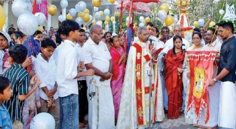 പുത്തനങ്ങാടി പാലൂത്തAറ പള്ളിയിലെ വി. യാക്കോബ് ശ്ലീഹായുടെ തിരുനാളിന് എറണാകുളം അങ്കമാലി അതിരൂപത സിഞ്ചലൂസ് ഫാ. ആന്റോ ചേരാംതുരുത്തി കൊടി ആശിർവദിക്കുന്നു