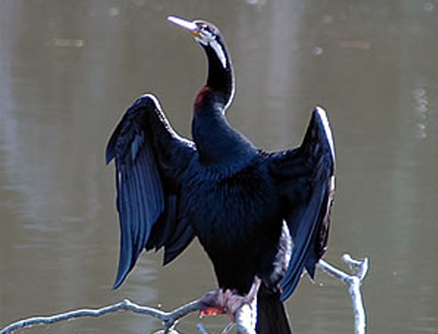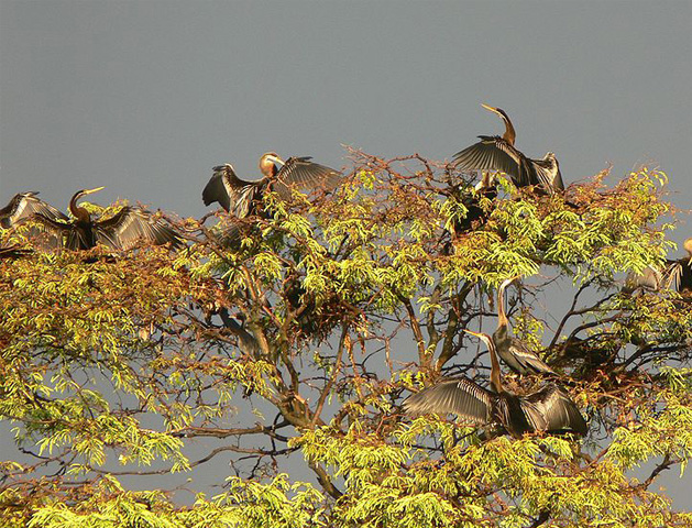 Darters are circum-equatorial, tropical or subtropical. They inhabit either fresh or brackish water and can be found in lakes, rivers, marshes, swamps, estuaries, bays, lagoons and mangrove swamps. They tend to gather in flocks sometimes up to about 100 birds but are highly territorial when breeding. Most are sedentary and do not migrate, however the populations at extreme distributions may migrate. The Oriental Darter is near-threatened species.Habitat destruction along with other human interferences is among the main reasons for a declining population.