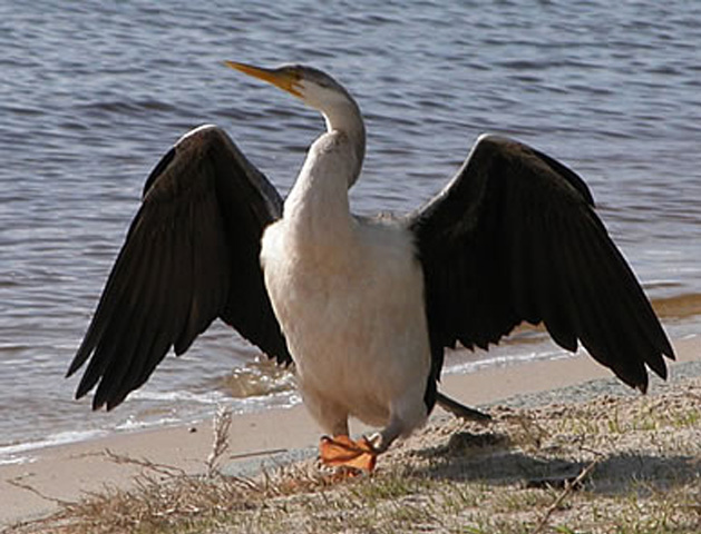 The darters are large birds with sexually dimorphic plumage. The males have black and dark brown plumage, an erectile crest on the nape and a larger bill than the female. The females have a much paler plumage especially on the neck and underparts. Both have grey stippling on long scapulars and upper wing coverts. The sharply pointed bill has serrated edges. The darters have completely webbed feet, and their legs are short and set far back on the body. Their plumage is somewhat permeable, like that of cormorants, and they spread their wings to dry after diving. Vocalizations include a clicking or rattling when flying or perching. During breeding adults sometimes have caw or hissing calls.