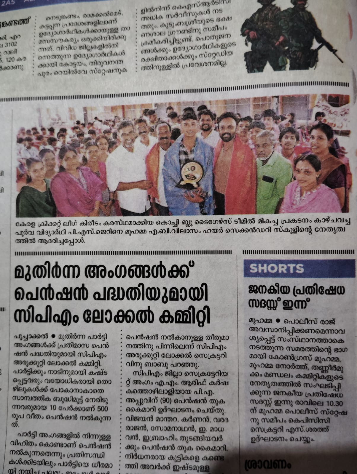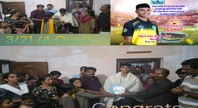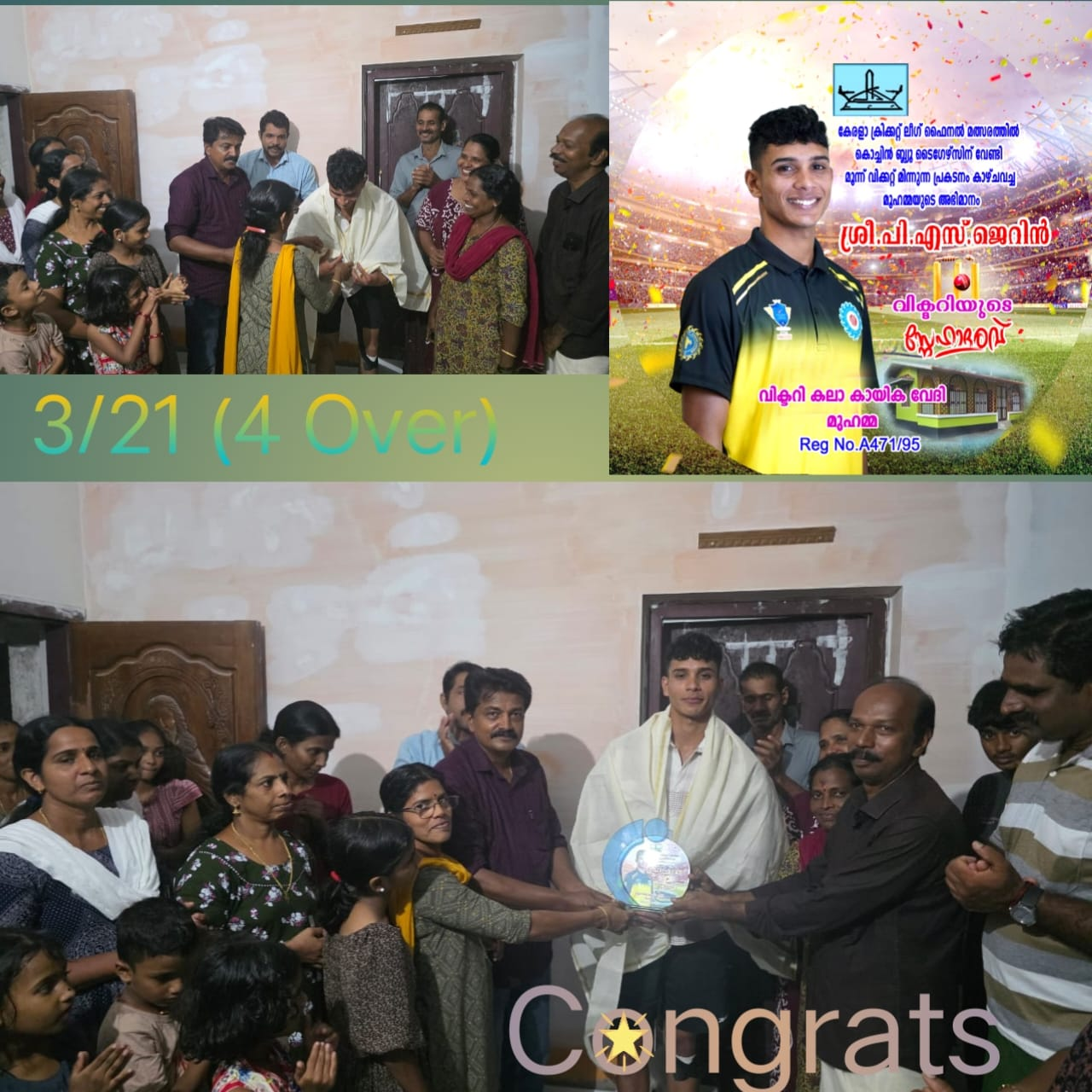 കേരള ക്രിക്കറ്റ് ലീഗ് രണ്ടാം സീസൺ ജേതാക്കളായ കൊച്ചിൻ ബ്ലൂടൈഗേഴ്സിനെ ഫൈനലിൽ വിജയത്തിലേക്ക് നയിച്ച മിന്നും താരമായ മുഹമ്മയുടെ സ്വന്തം പി എസ് ജെറിന് സ്നേഹാദരം.. ഒരു കായിക കുടുംബമാണ് ജെറിന്റെത്… ചേച്ചി സനിത ഹർഡിൽസിൽ നാഷണൽ ലെവൽ കളിച്ചിട്ടുള്ളയാളാണ്…