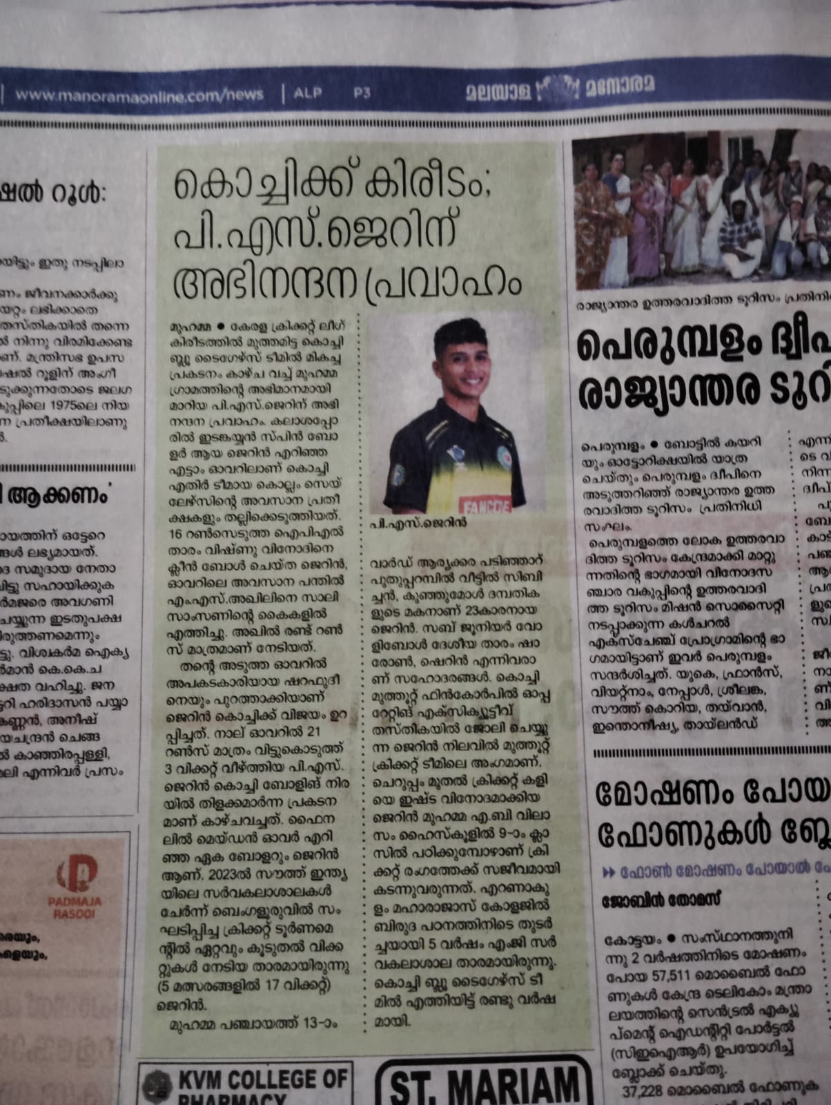 ലോക ക്രിക്കറ്റിൽ അജയ് ജഡേജയ്ക്കും, പ്രശാന്ത് പരമേശ്വരനും ശേഷം മുഹമ്മയുടെ പേര് ജെറിനിലൂടെ ലോക ക്രിക്കറ്റിൽ ഇടം നേടട്ടെ എന്ന് ആശംസിക്കുന്നു